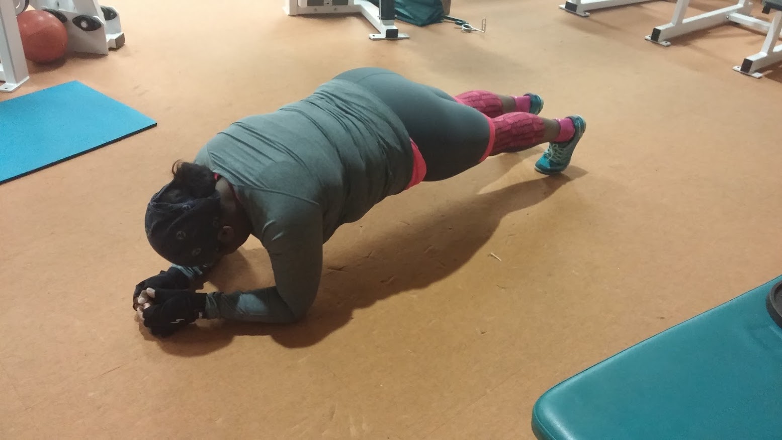 Planking--ugh. Gear: Top is Charmer Long Sleeve by Skirt Sports, Capris by Under Armour, Socks by Swiftwick and Shoes by Merrell.